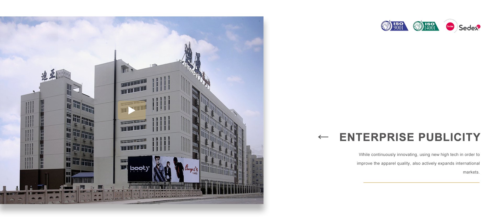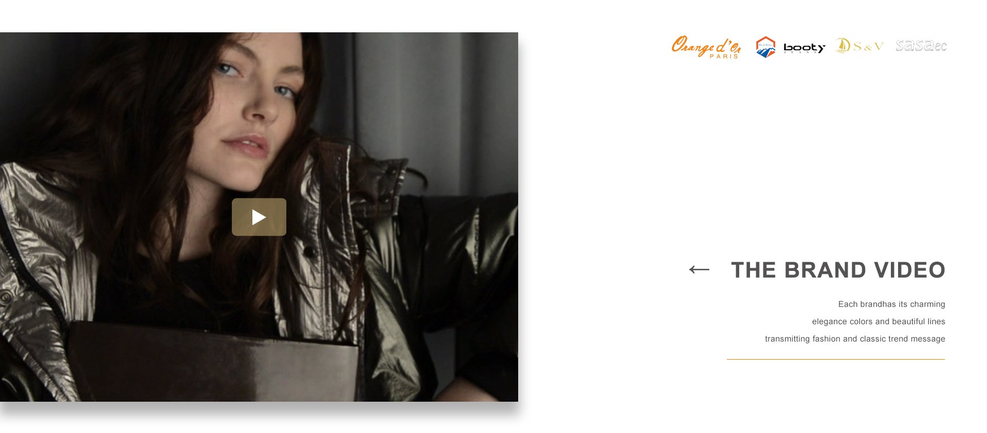 品牌建設(shè)是公司堅持不懈的追求,我們每年都會積極參加國內(nèi)外舉辦的各大服裝展銷會。憑借著良好的質(zhì)量與信譽,市場占有率在逐漸擴大,產(chǎn)品遠銷歐洲、美洲、亞洲等國。公司以生產(chǎn)棉衣、羽絨服、派克、大衣、夾克、運動休閑服飾等為主,旗下主打品牌有 ORANGE D’OR 、CLAIRVAL、BOOTY JEANS 、S&V和SASAEC,各品牌服飾均以典雅的色彩、優(yōu)美的線條、卓越的魅力吸引著都市麗人,將時尚、經(jīng)典的潮流信息予以淋漓盡致的演繹。